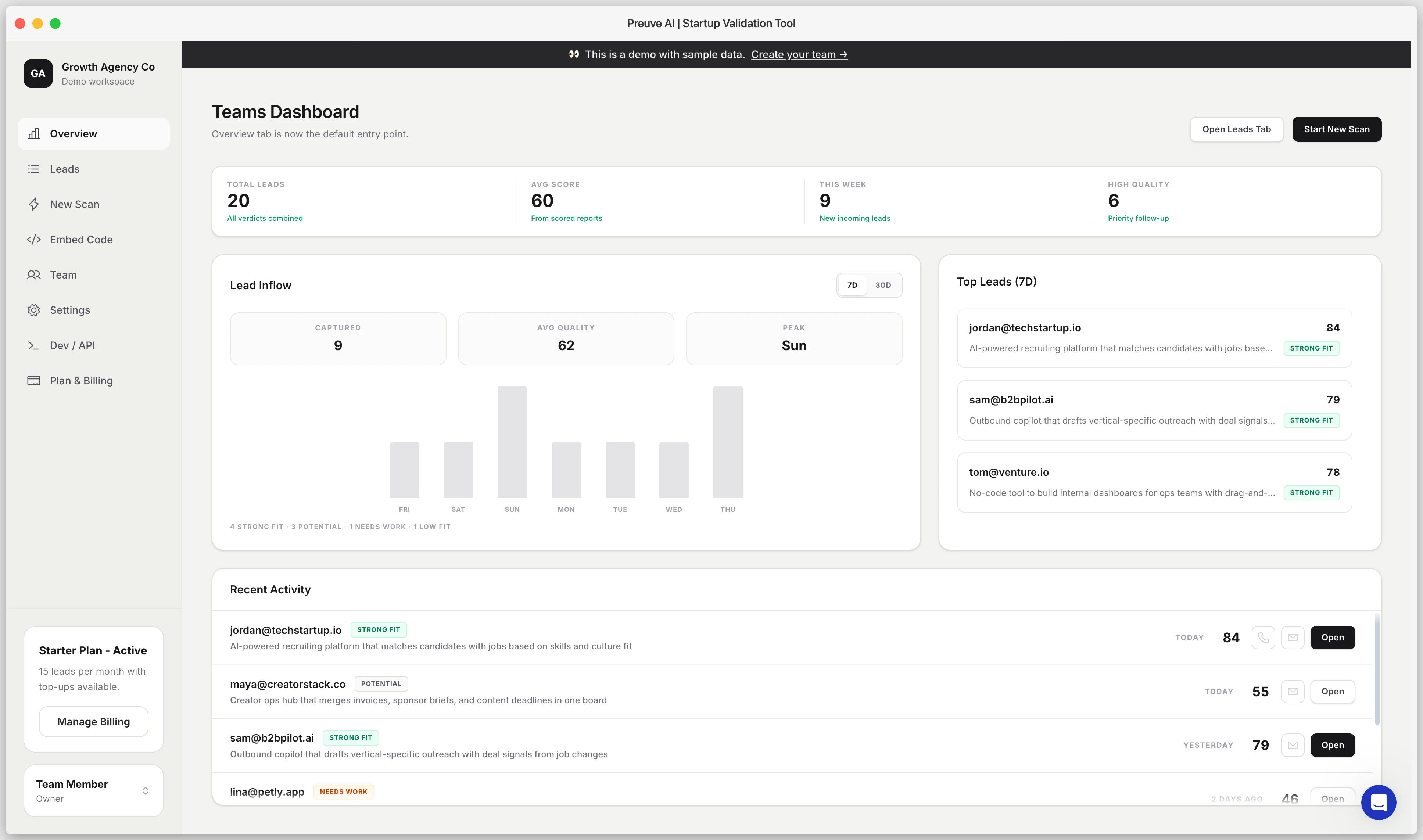 Preuve AI for Teams is a white-label lead qualification tool for startup-facing teams. Agencies use it to pre-qualify startup leads before the discovery call. Accelerators and incubators use it for first-pass application screening. VCs and angel networks use it to score inbound deal flow before partner review. Venture studios use it to compare internal ideas against live market data. Each inbound project gets a sourced market report, competitor analysis, TAM/SAM/SOM market sizing, and a readiness score in 5 minutes. Every claim links to its source. Pricing starts with 5 free projects, then Starter at $149 per month for 15 projects, Pro at $299 per month for 30 projects, and Scale at $599 per month for 60 projects.